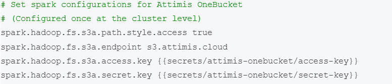 This configuration is set once at the cluster level. After this, all data sources behind Attimis OneBucket are automatically available to every notebook and job on the cluster.