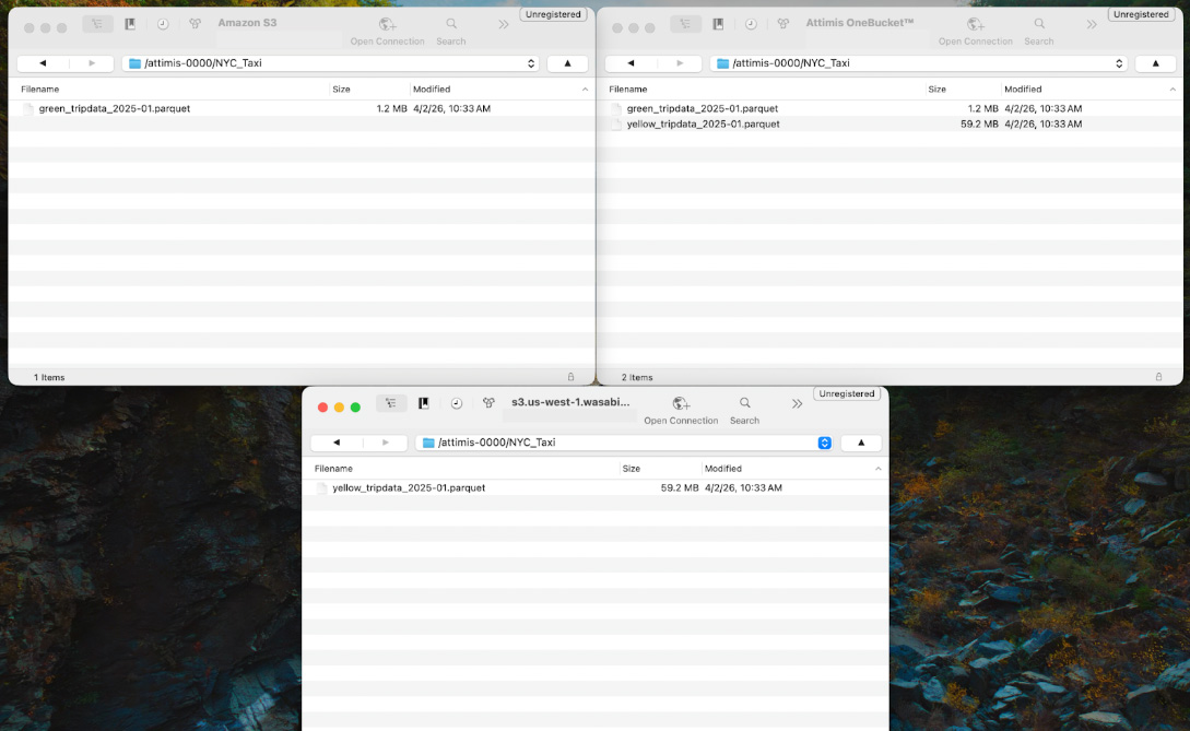 df_combined.write.mode("overwrite").parquet("s3a://attimis-0000/NYC_Taxi_New") Because the cluster is connected to s3.attimis.cloud, Spark interacts with a single logical storage endpoint. In the background, Attimis policies determine where the data is physically stored and can replicate or distribute objects across multiple storage platforms such as AWS, Wasabi, or other cloud, on-prem, or edge storage systems.