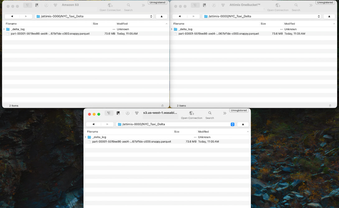 "AWS_ENDPOINT_URL": f"https://{ENDPOINT}"} ) Because Attimis OneBucket is configured to write to multiple storage endpoints, the Delta table is automatically written to each configured location. In this example, the NYC_Taxi_Delta/ dataset is replicated to both AWS and Wasabi storage systems while Databricks interacts with the single s3.attimis.cloud endpoint.